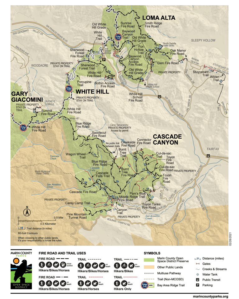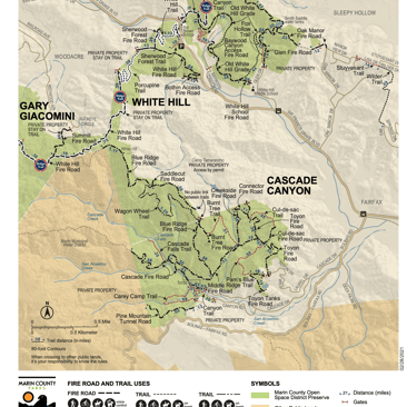 504 Acres Travel through to adjacent White Hill Preserve and Marin Municipal Water District lands. Cascade Canyon in Fairfax was acquired in the1970's by the Marin County Open Space District (MCOS) from the Elliott family.